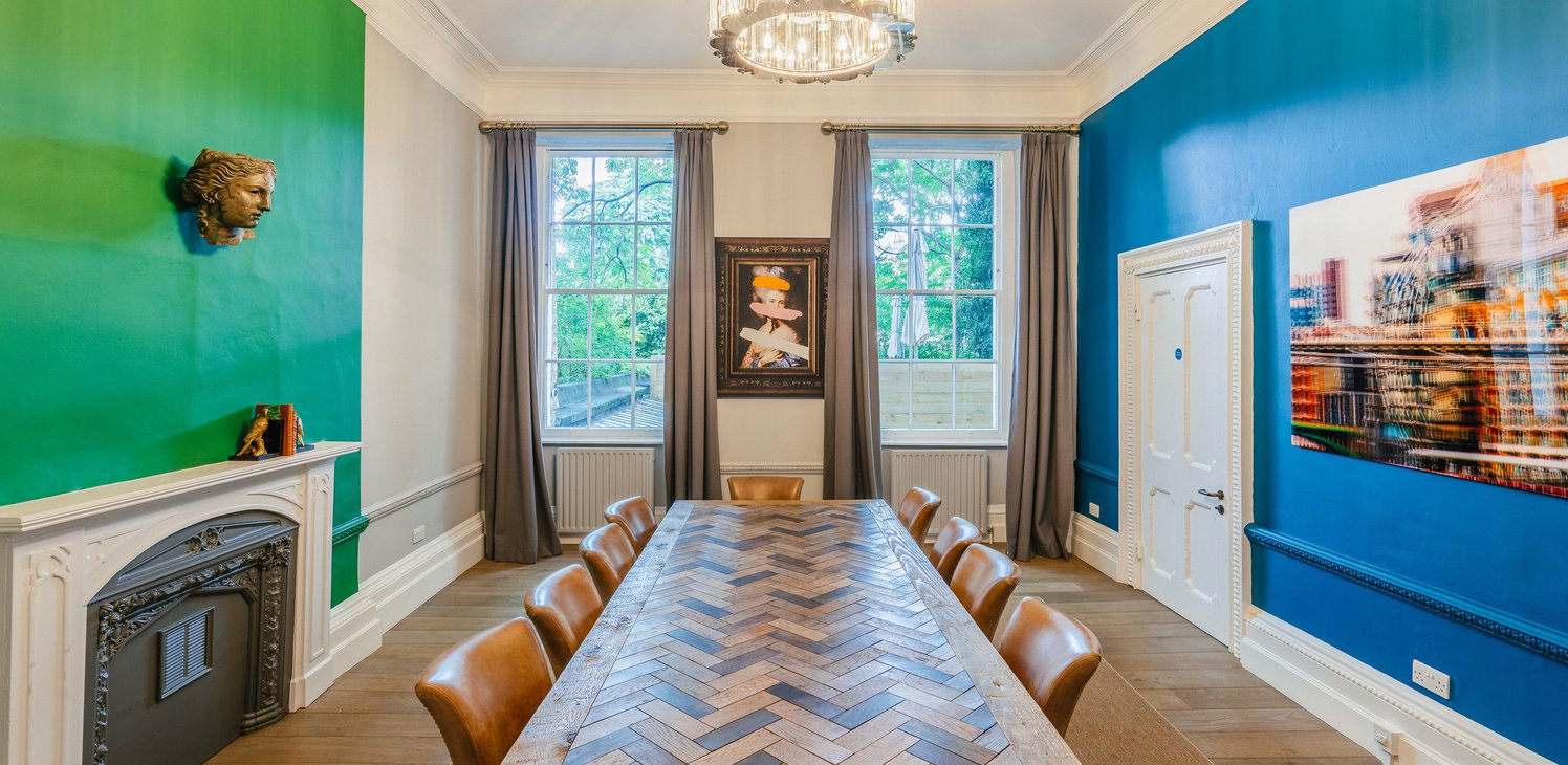 The Study is a quiet boardroom with a large oak table surrounded by artwork such a large map and painting. The Study does not have any AV equipment, so it used for meetings and a quiet space. Or as a catering room, particularly when used together with the adjoining Lounge. The Study has windows overlooking the outdoor terrace, and next door to a tech zone where guests can use the communal computers.