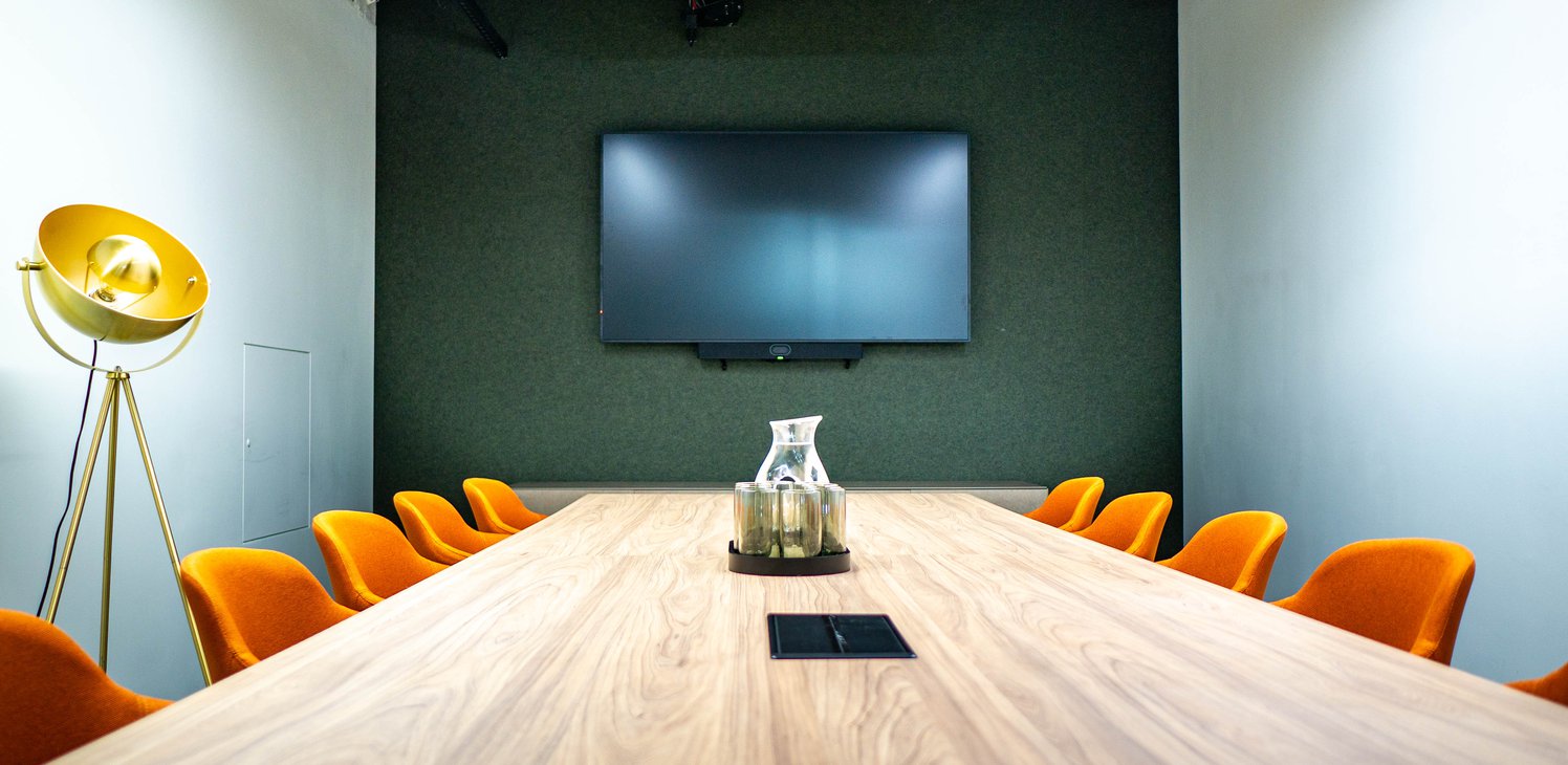 10 person meeting room. A spacious, design-led meeting room ideal for client presentations and team strategy sessions. Featuring a 65" commercial display, integrated video conferencing, and premium acoustic performance, this space ensures every conversation is clear and impactful.