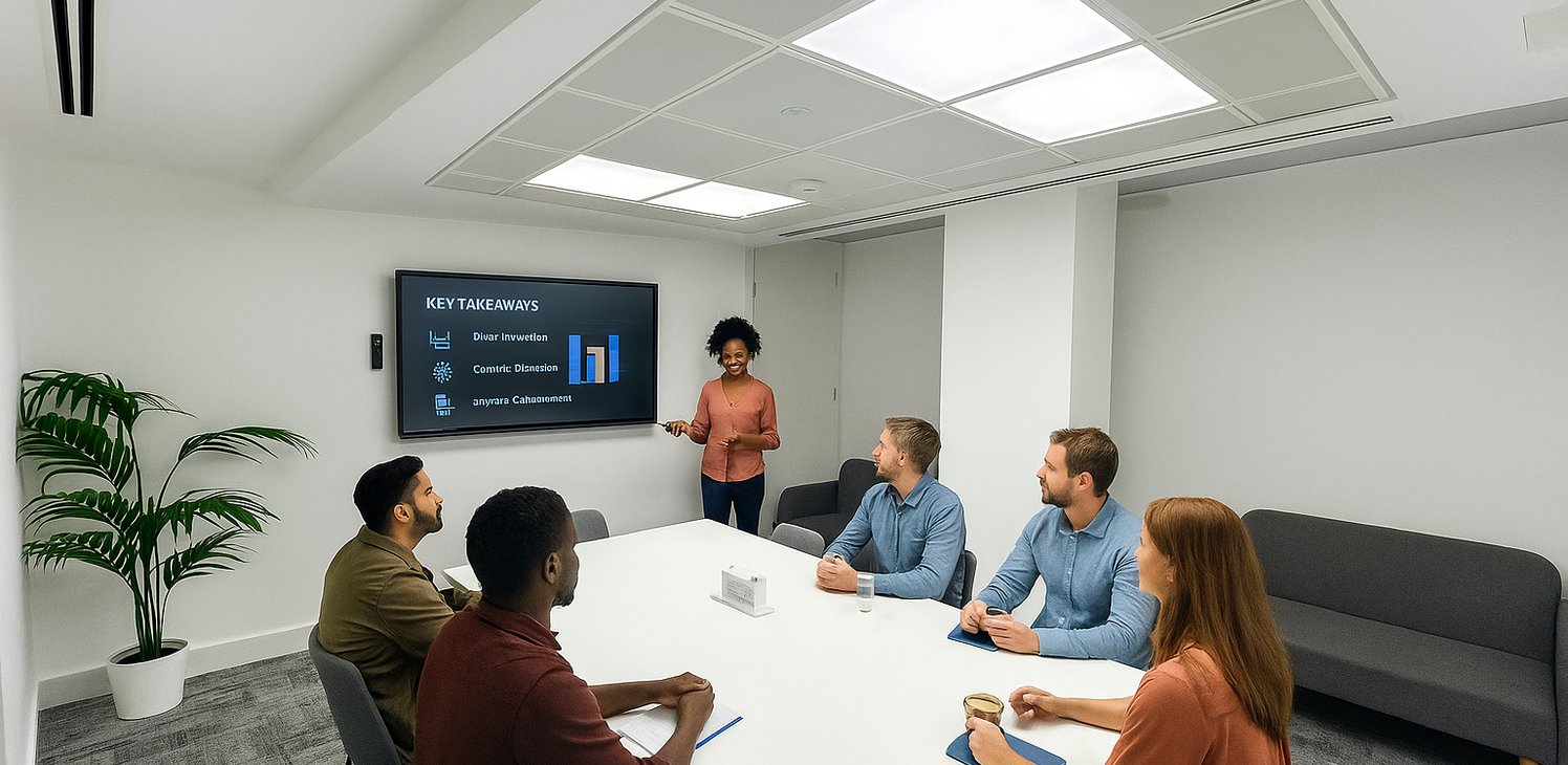 This modern and comfortable meeting room is perfect for smaller team meetings, client presentations, or brainstorming sessions. Designed to accommodate up to 10 people in a boardroom-style layout, the space offers both functionality and comfort.