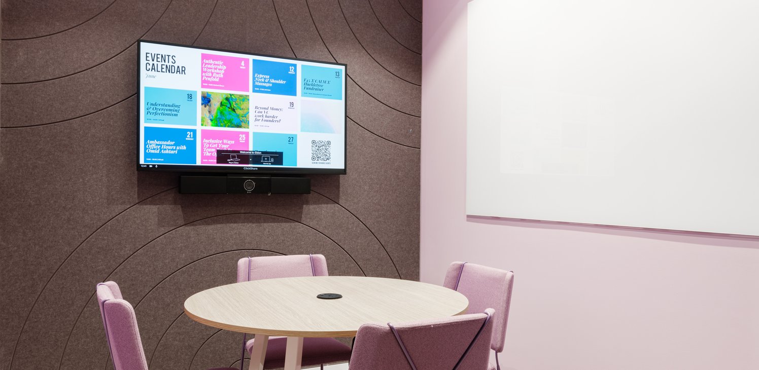 Eldon is on the first floor and hosts up to 4 people. It comes equipped with top-of-the-range AV tech (LED screen, mic, webcam) for hybrid meetings